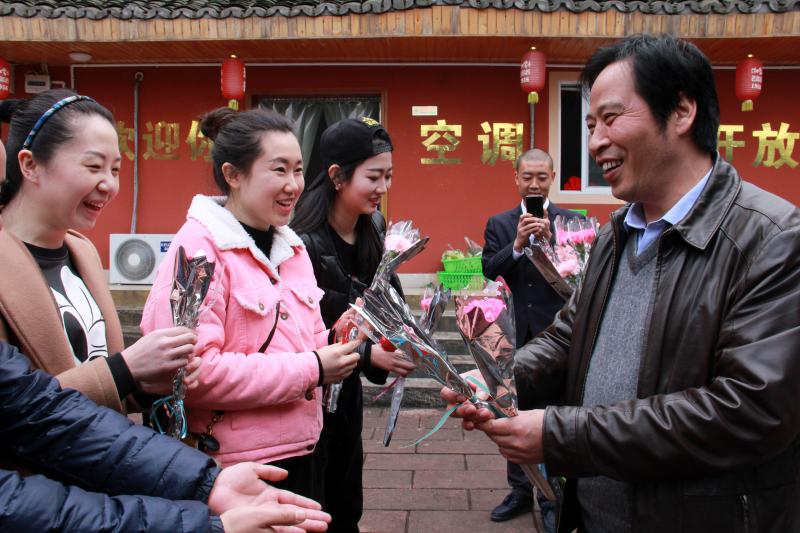 工會主席李興明(右一)為女職工送上鮮花