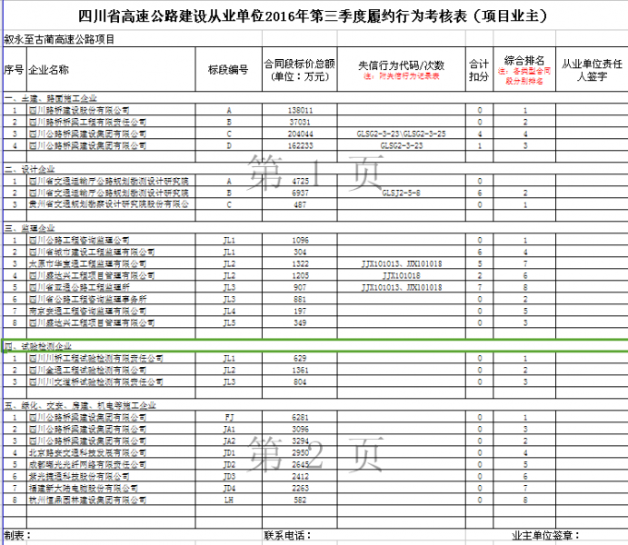 四川省高速公路建設從業單位2016年第三季度履約行為考核表(項目業主)