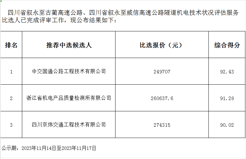 四川省敘永至古藺高速公路、四川省敘永至威信高速公路隧道機電技術狀況評估服務中選候選人公示名單