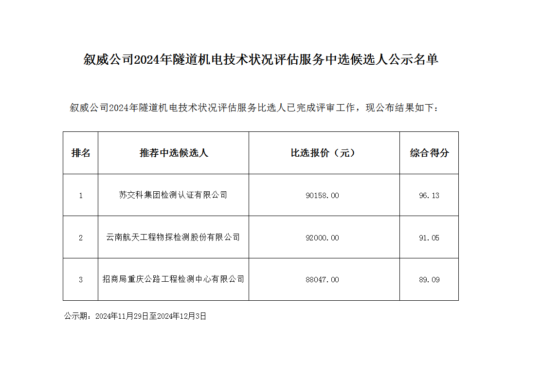敘威公司2024年隧道機電技術狀況評估服務中選候選人公示名單