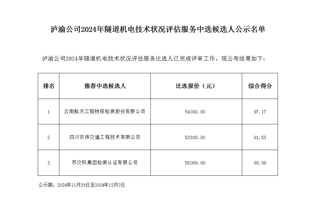 瀘渝公司2024年隧道機電技術狀況評估服務中選候選人公示名單